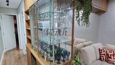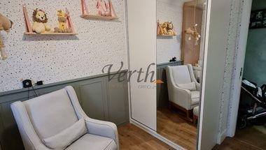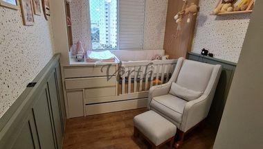 O apartamento conta com 2 dormitórios, no quarto do casal além do guarda roupas tem um modulo de sapateiro e penteadeira com porta joias e painel de TV, o segundo Dormitório esta todo decorado com tema infantil, o berço com trocador é modular e pode ser adaptado a uma cama de solteiro, no corredor um armário de apoio para toalhas e documentos, estante de livros, cristaleira e um nicho para adega com capacidade de 24 garrafas.