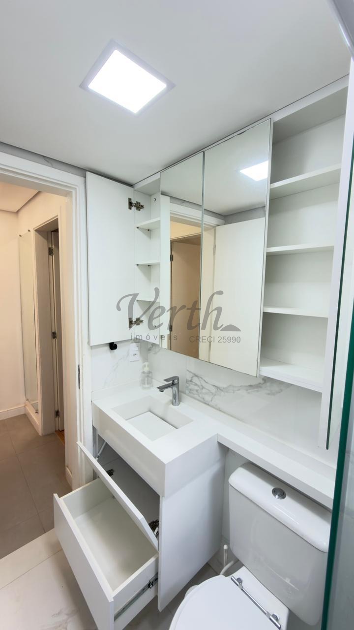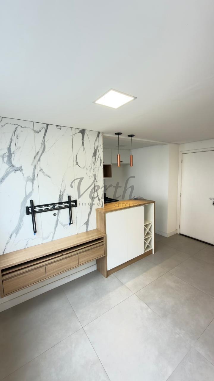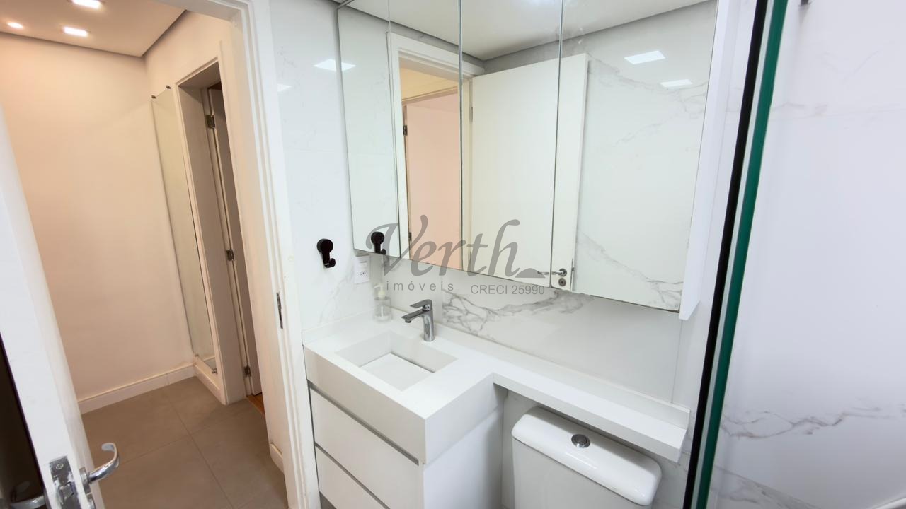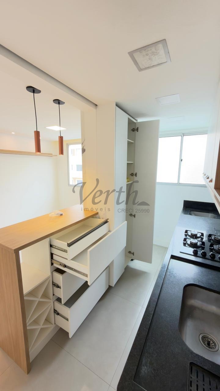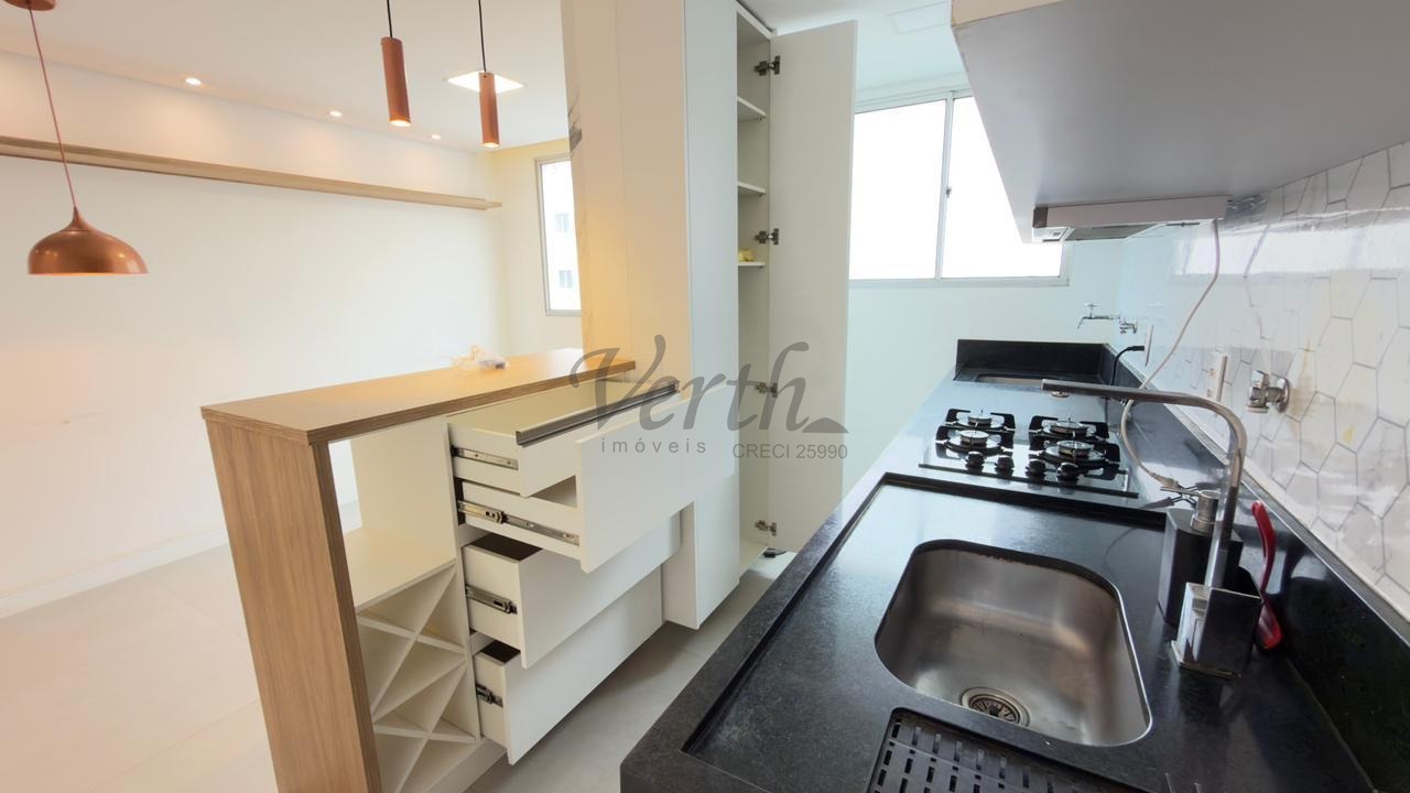 O apartamento conta com cozinha americana equipada com eletrodomésticos embutidos, lavanderia separada, armários planejados em todos os ambientes e piso em porcelanato. Com acabamento moderno e pronto para morar, o imóvel está desocupado e aceita financiamento, oferecendo facilidade na negociação.