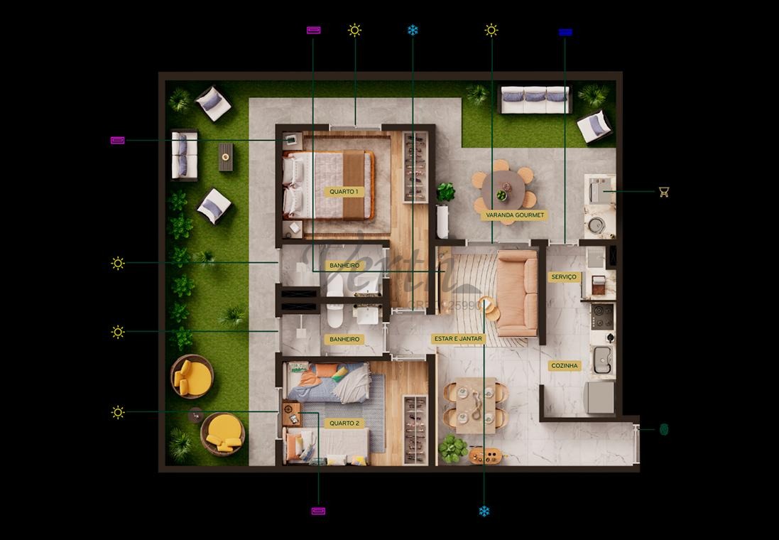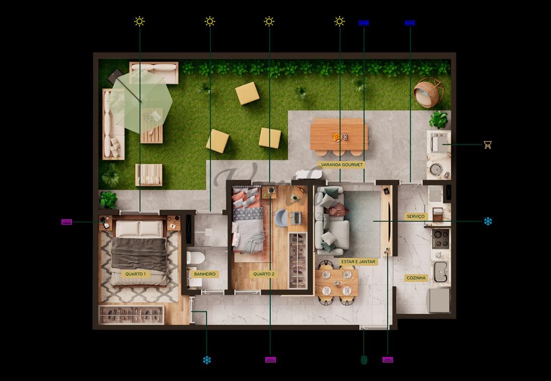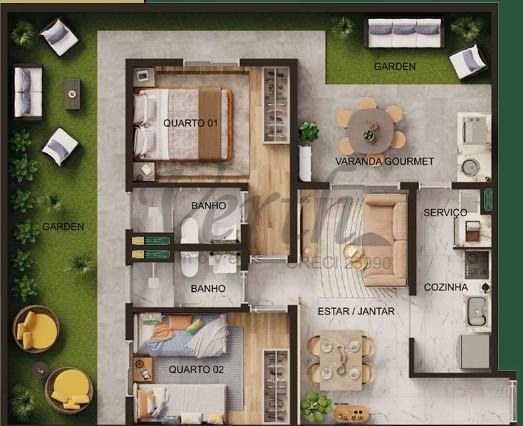 Unidade Garden, com um espaço aberto privativo para sua família. Varanda gourmet Espaço para condensadora de ar Banheiros com iluminação e ventilação naturais Iluminação e ventilação naturais independentes para cozinha e área de serviço