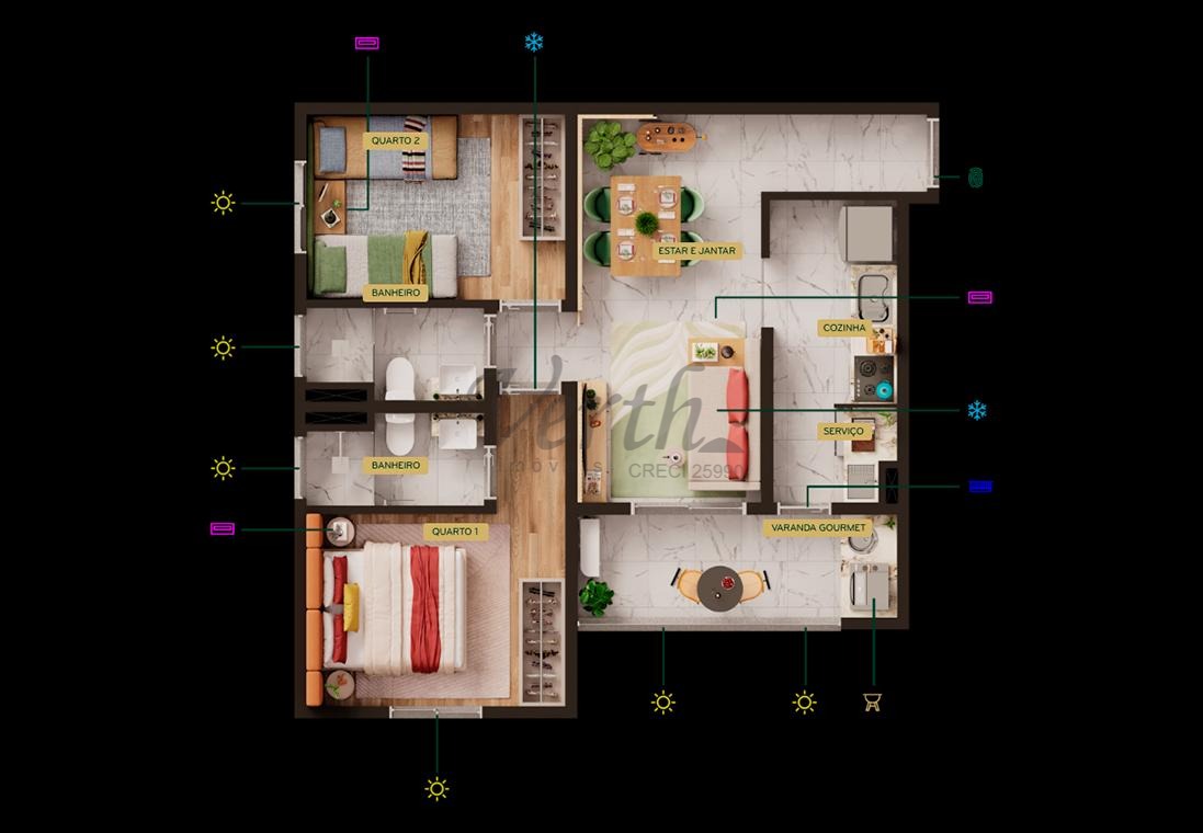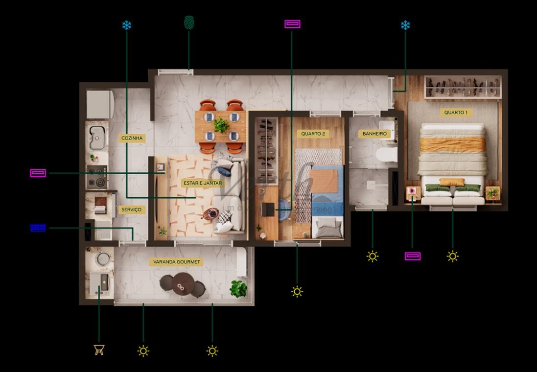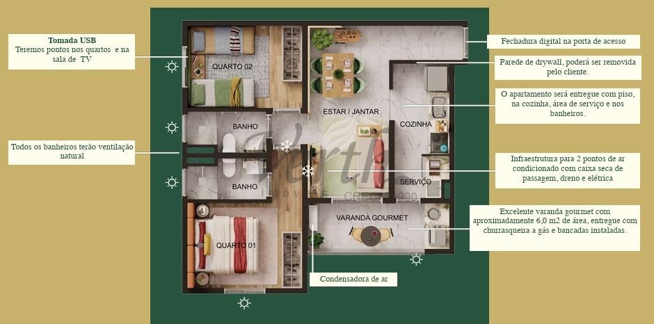 Apartamento de 58 m², 2 dormitórios sendo 1 suíte. Varanda gourmet Espaço para condensadora de ar Banheiros com iluminação e ventilação naturais Iluminação e ventilação naturais independentes para cozinha e área de serviço