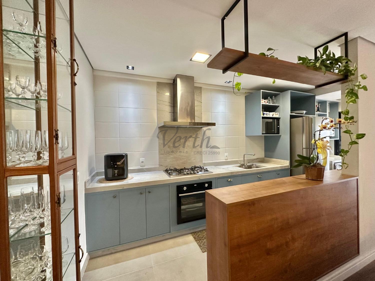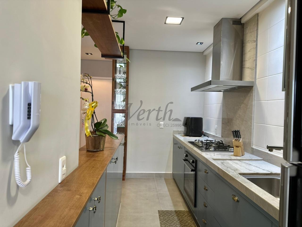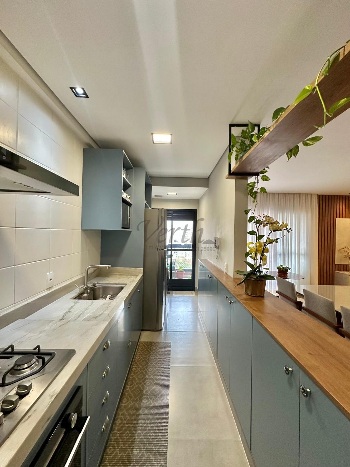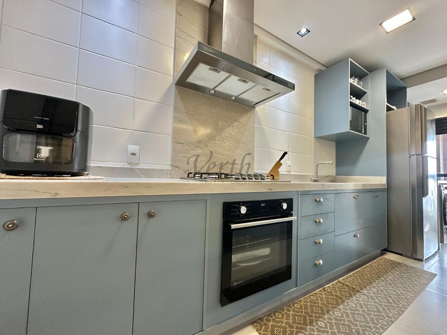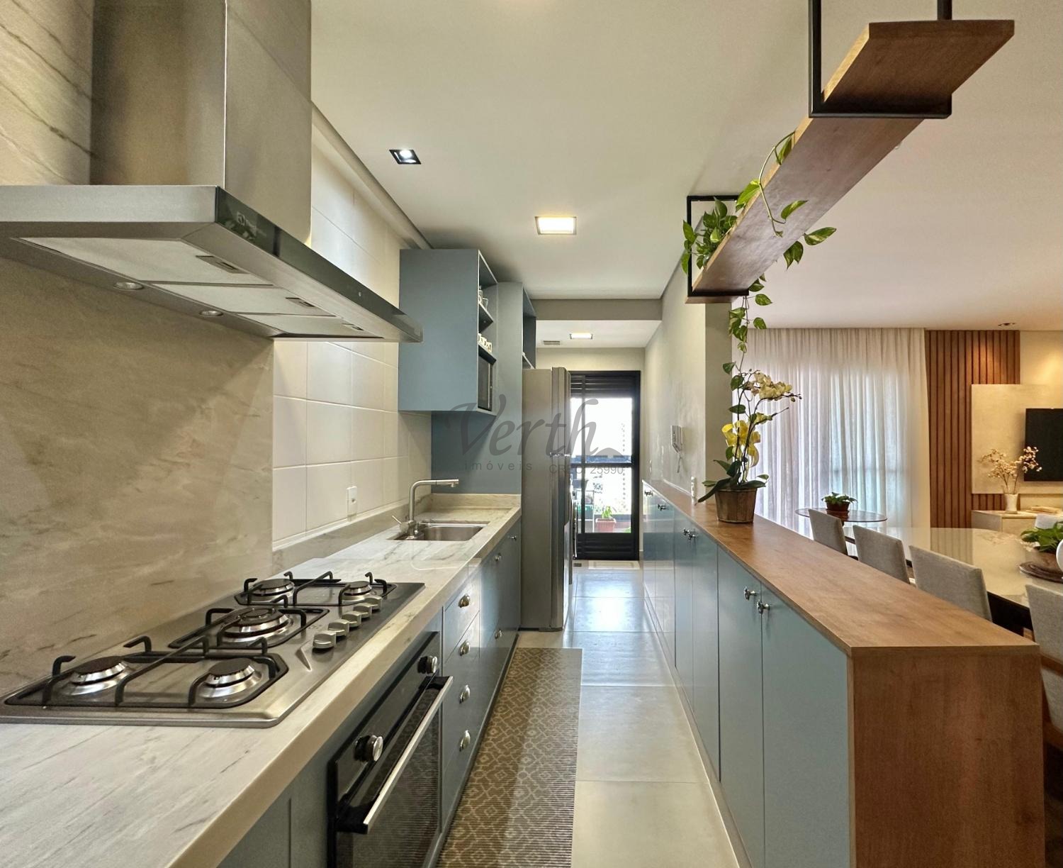 A cozinha se destaca pela amplitude e pela funcionalidade, equipada com pia em quartzito de 3,60 metros e armários planejados, mantendo o padrão de organização e aproveitamento dos espaços.