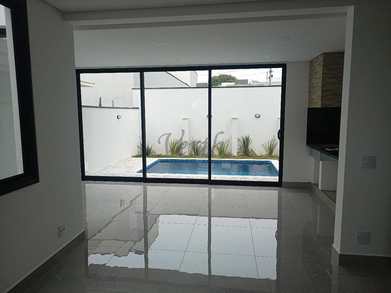 Churrasqueira fechada com área de luz e banheiro externo para piscina