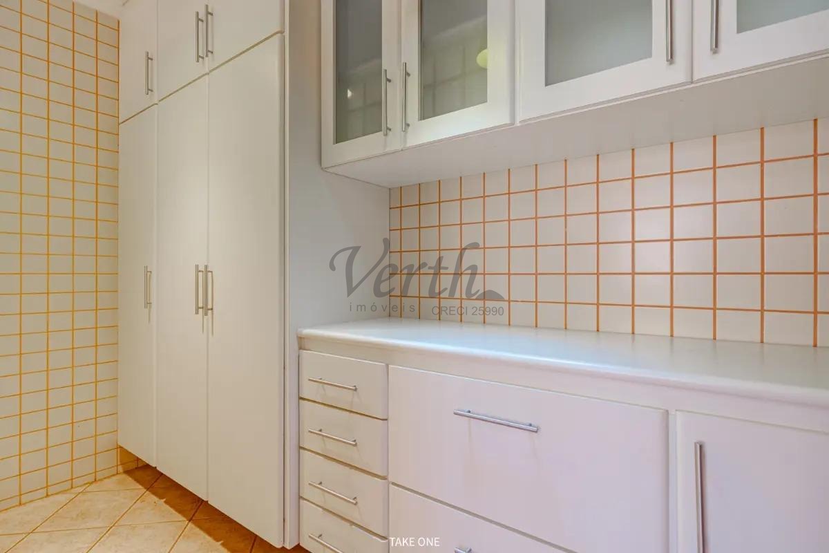 A cozinha é funcional e bem distribuída, com muitos armários planejados e uma despensa independente. A lavanderia, também com armários, oferece espaço reservado para varal e acesso ao banheiro de serviço. Um escritório isolado com bancada ampla e armários atende perfeitamente ao trabalho remoto.