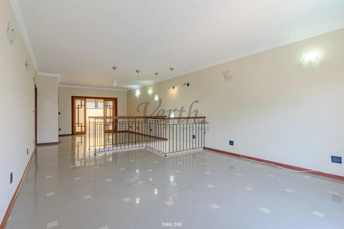 No pavimento superior, a sala principal se destaca pelo acabamento refinado em porcelanato, detalhes em granito, teto com gesso rebaixado e diversas luminárias que criam uma atmosfera acolhedora. A sacada integrada proporciona vista privilegiada para a área externa com piscina. A sala de jantar, espaçosa e bem iluminada, conecta-se ao jardim de inverno e à sala de estar. O lavabo, decorado com requinte, possui bancada em mármore.