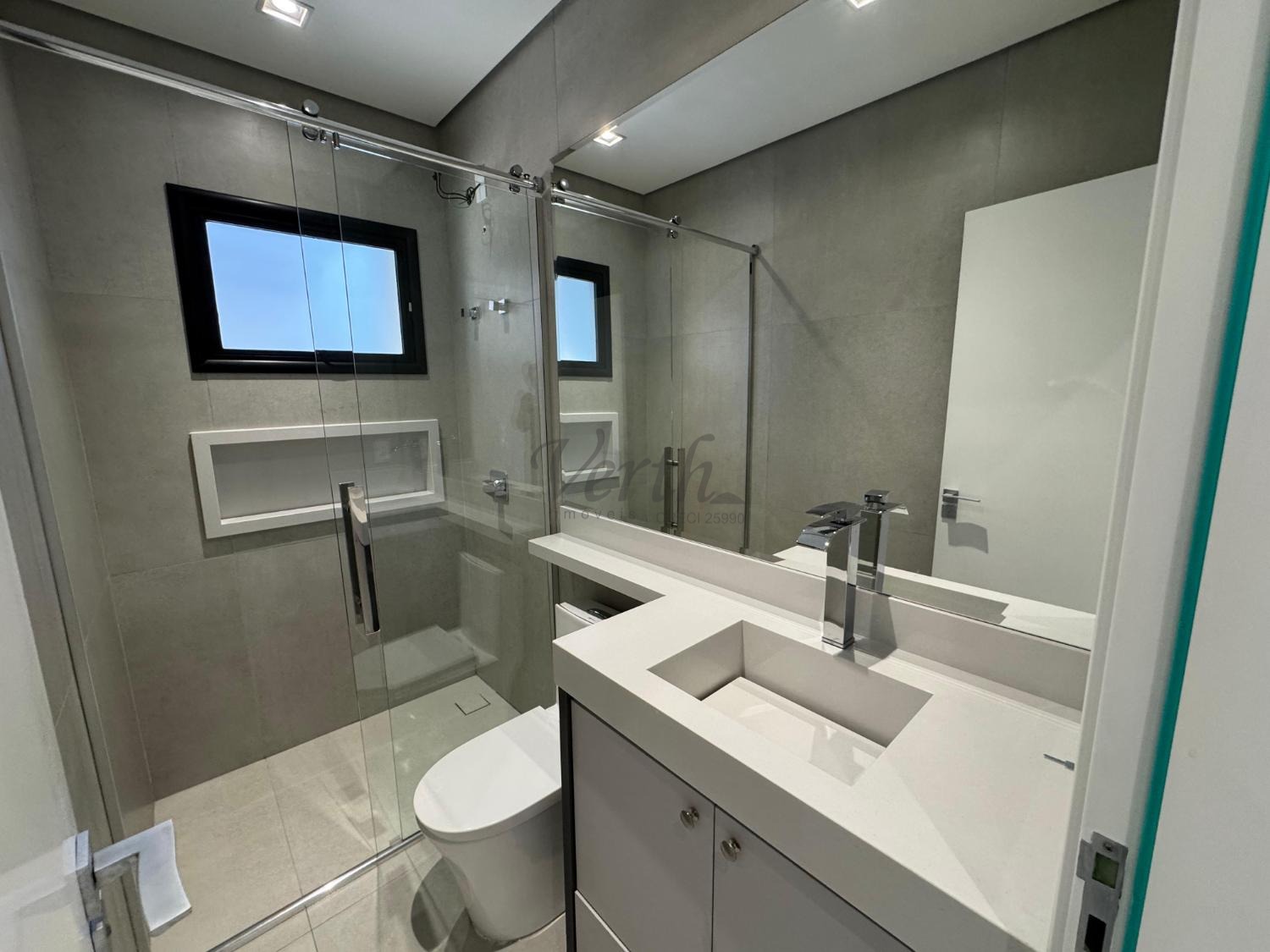 Banheiros com box de alto padrão e espelhos