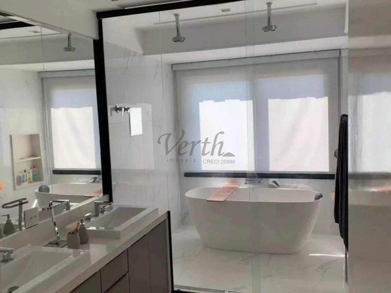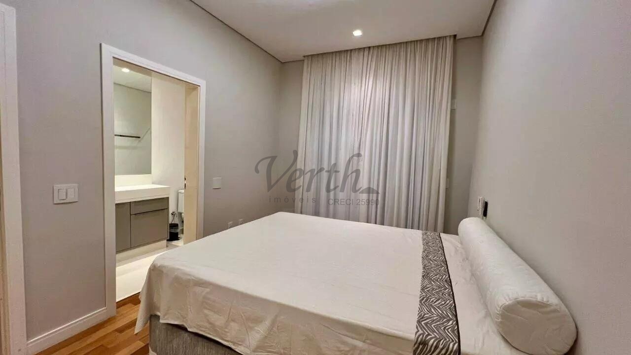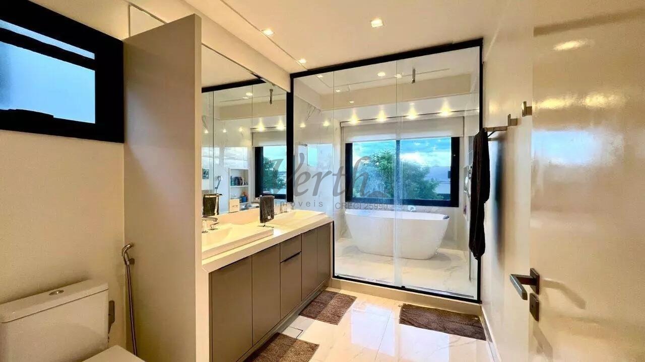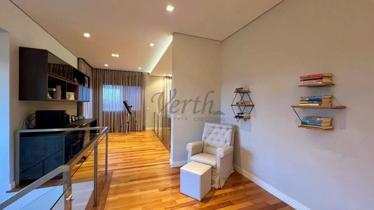 O piso superior conta com 3 suítes, sendo 1 suíte master com closet. No mesmo andar, há 1 escritório e 2 sacadas. A suíte master inclui uma banheira de pedra vulcânica natural.