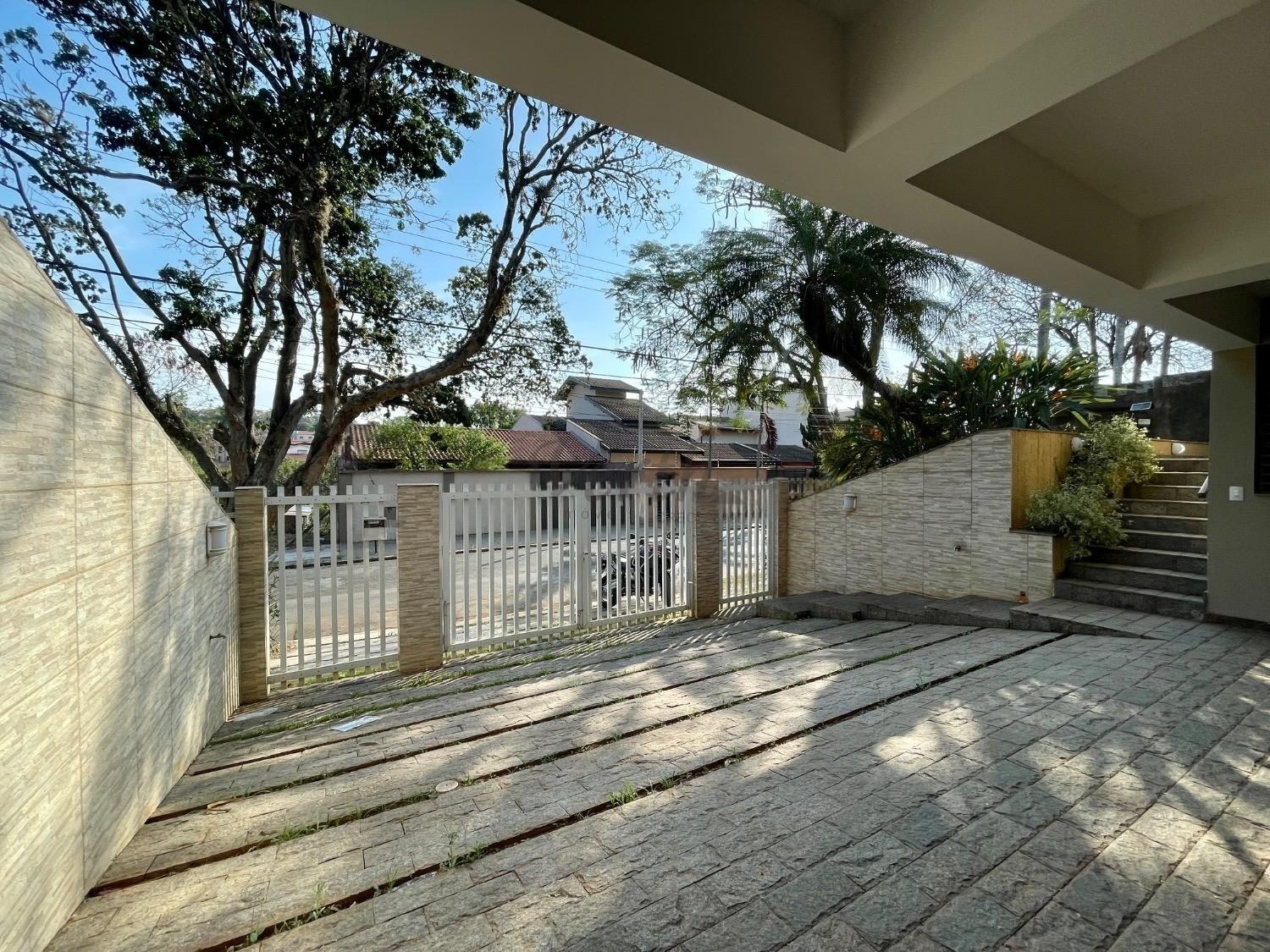 A casa possui um quintal com piscina e uma área de churrasqueira, oferecendo um espaço completo para lazer. A garagem tem capacidade para 5 carros. No interior, todos os dormitórios estão equipados com armários, e há um roupeiro adicional no corredor, oferecendo soluções de armazenamento.