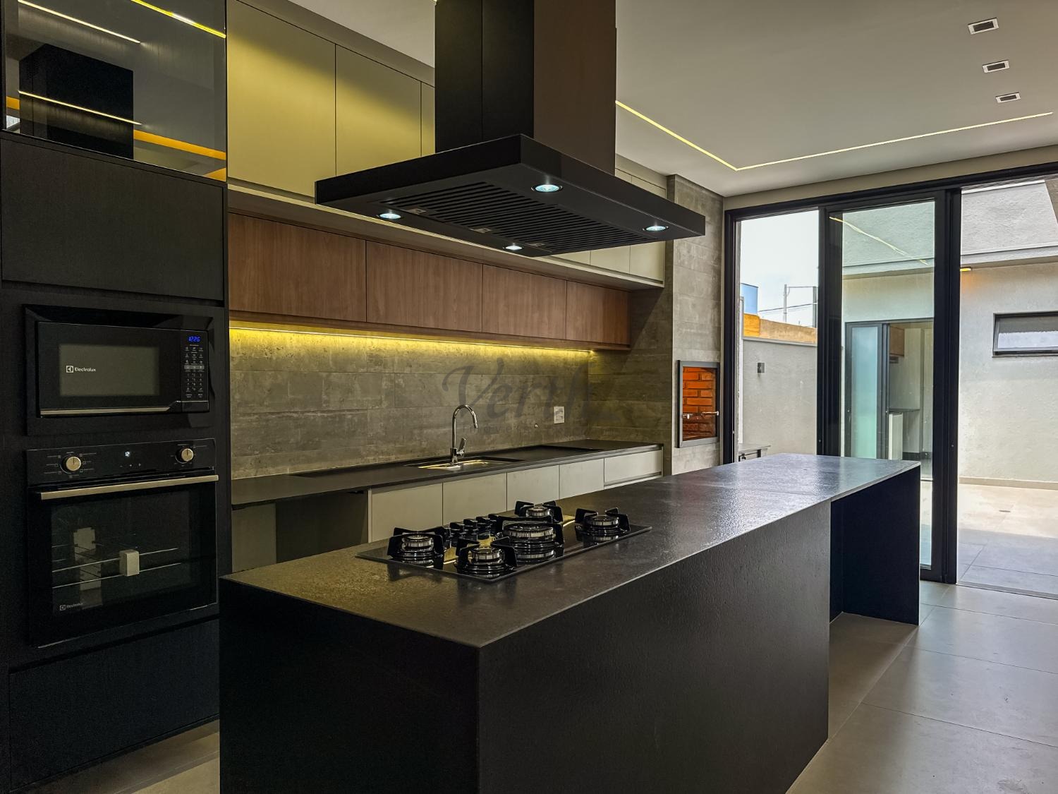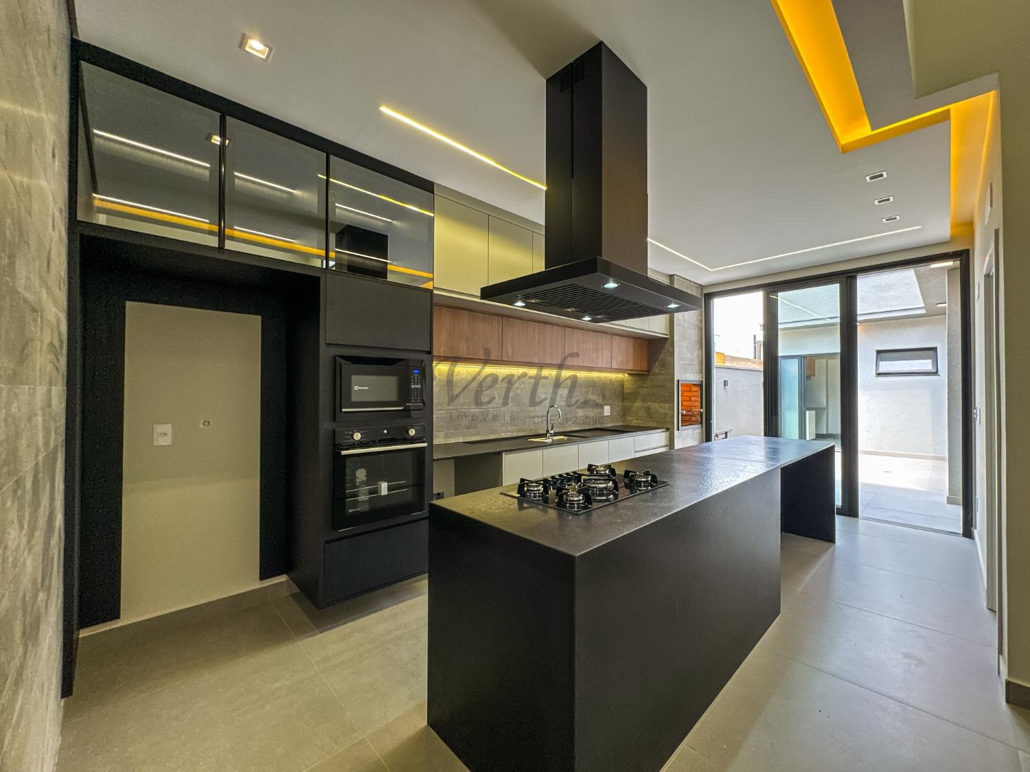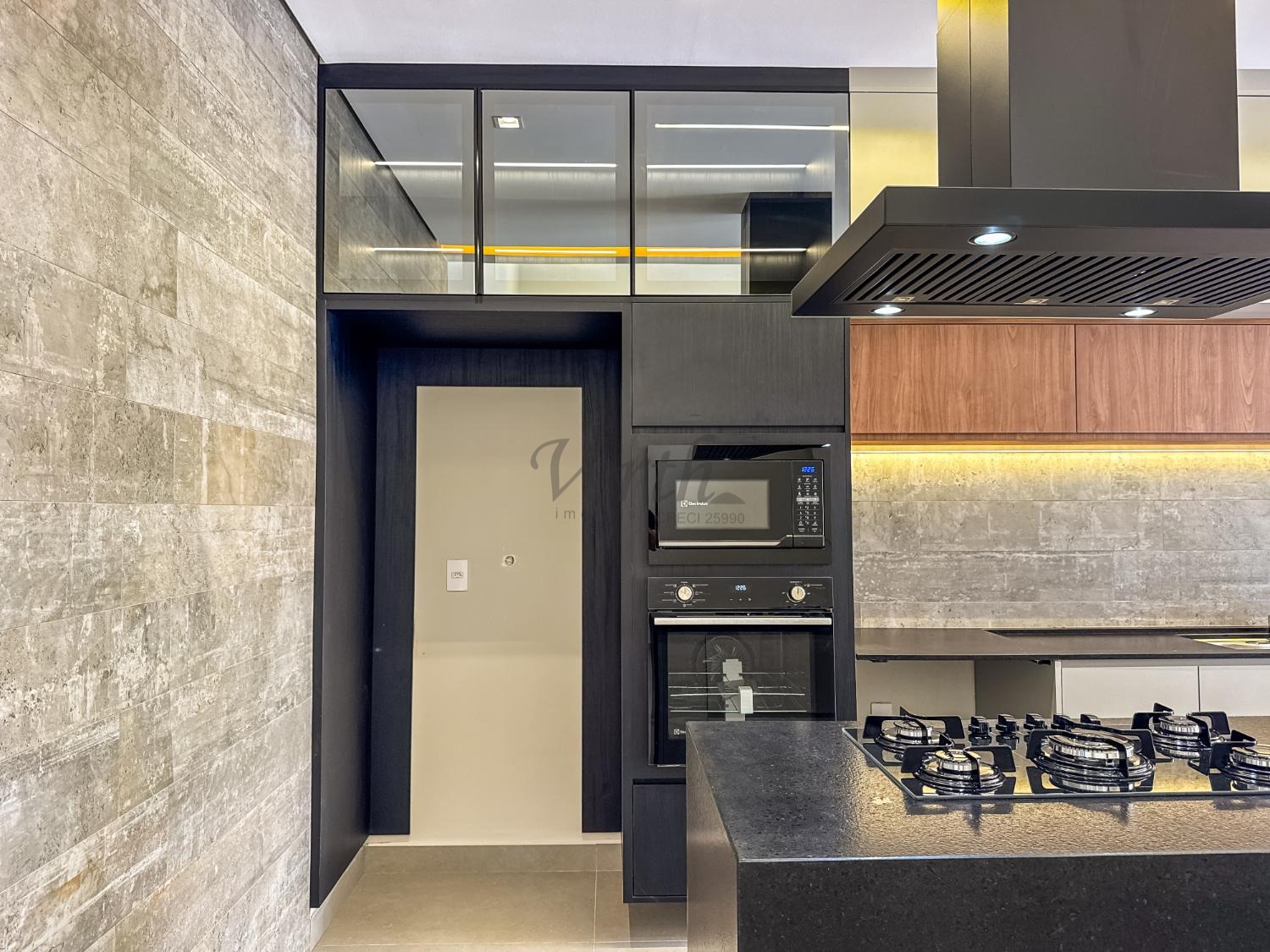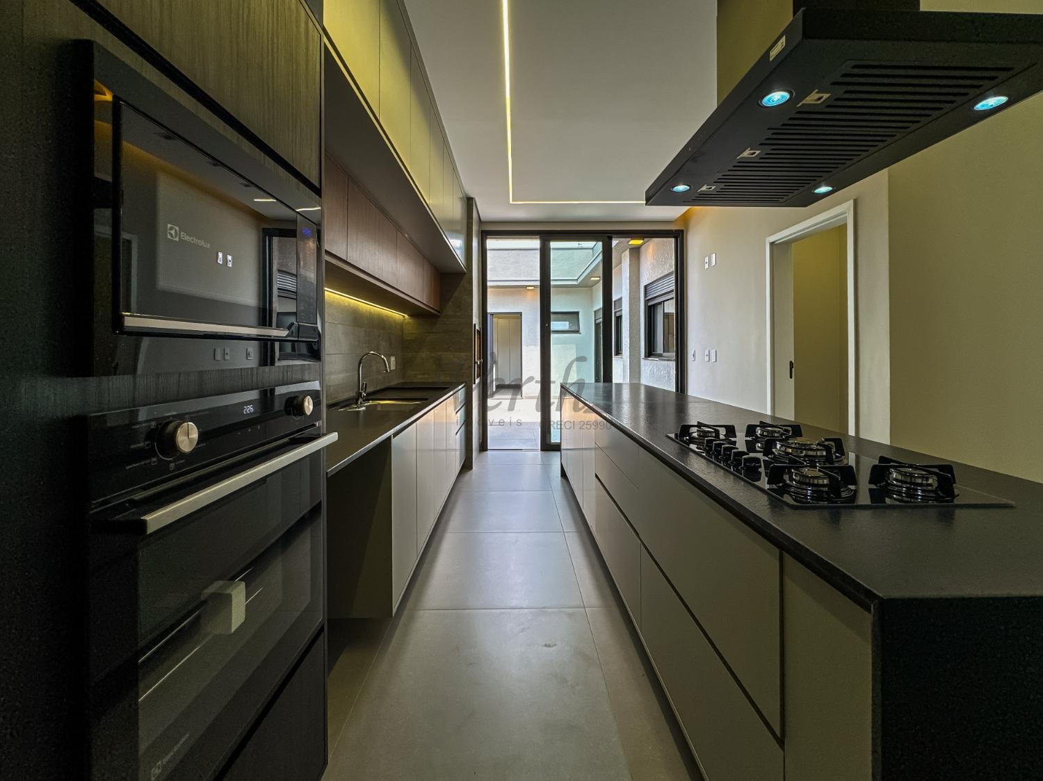 Cozinha equipada com cooktop, forno, micro-ondas, coifa e armários planejados