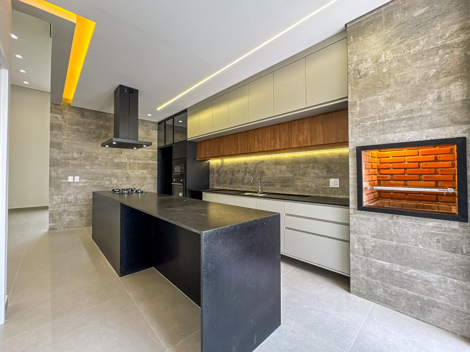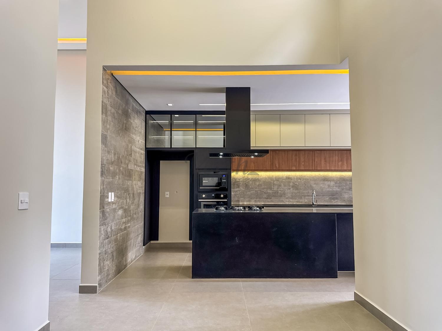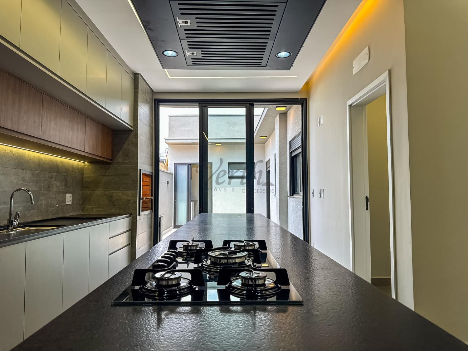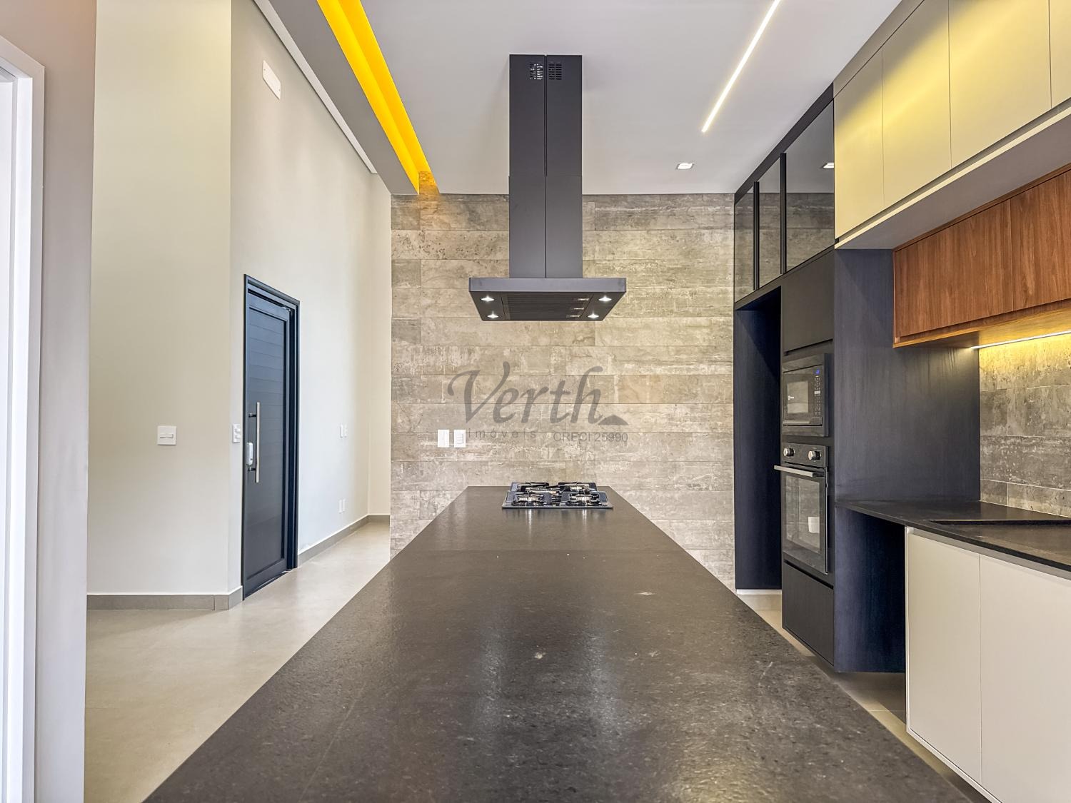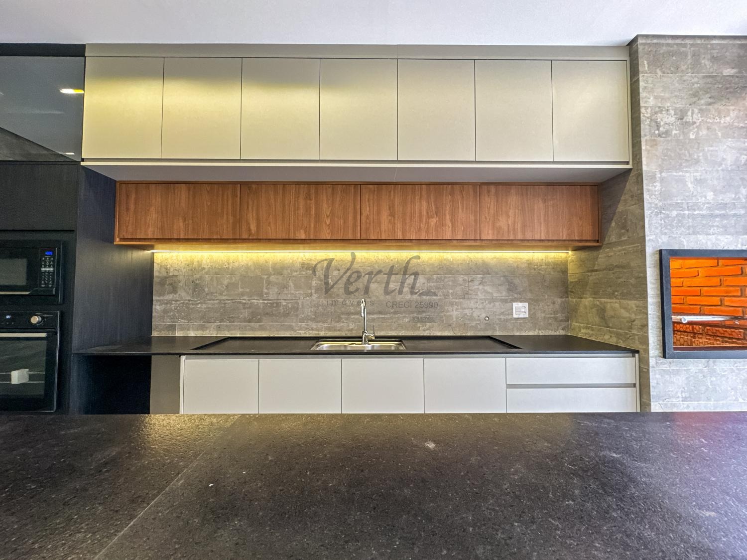 Cozinha equipada com cooktop, forno, micro-ondas, coifa e armários planejados