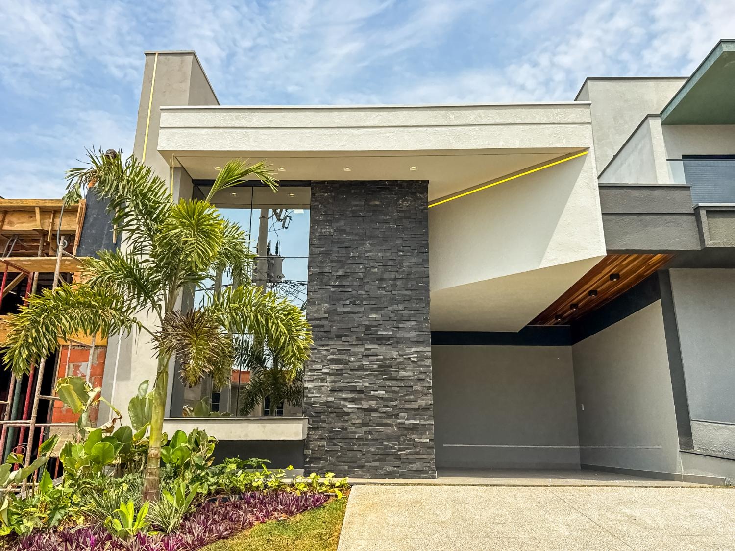 Fachada moderna com revestimentos e janela em pele de vidro