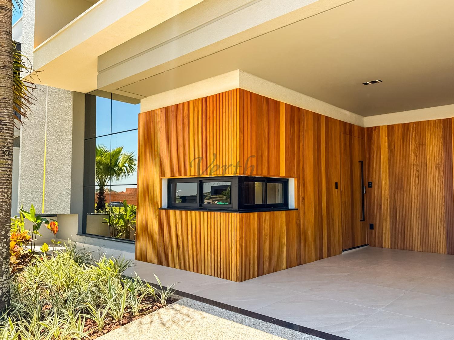Paisagismo tropical que valoriza o design da residência.