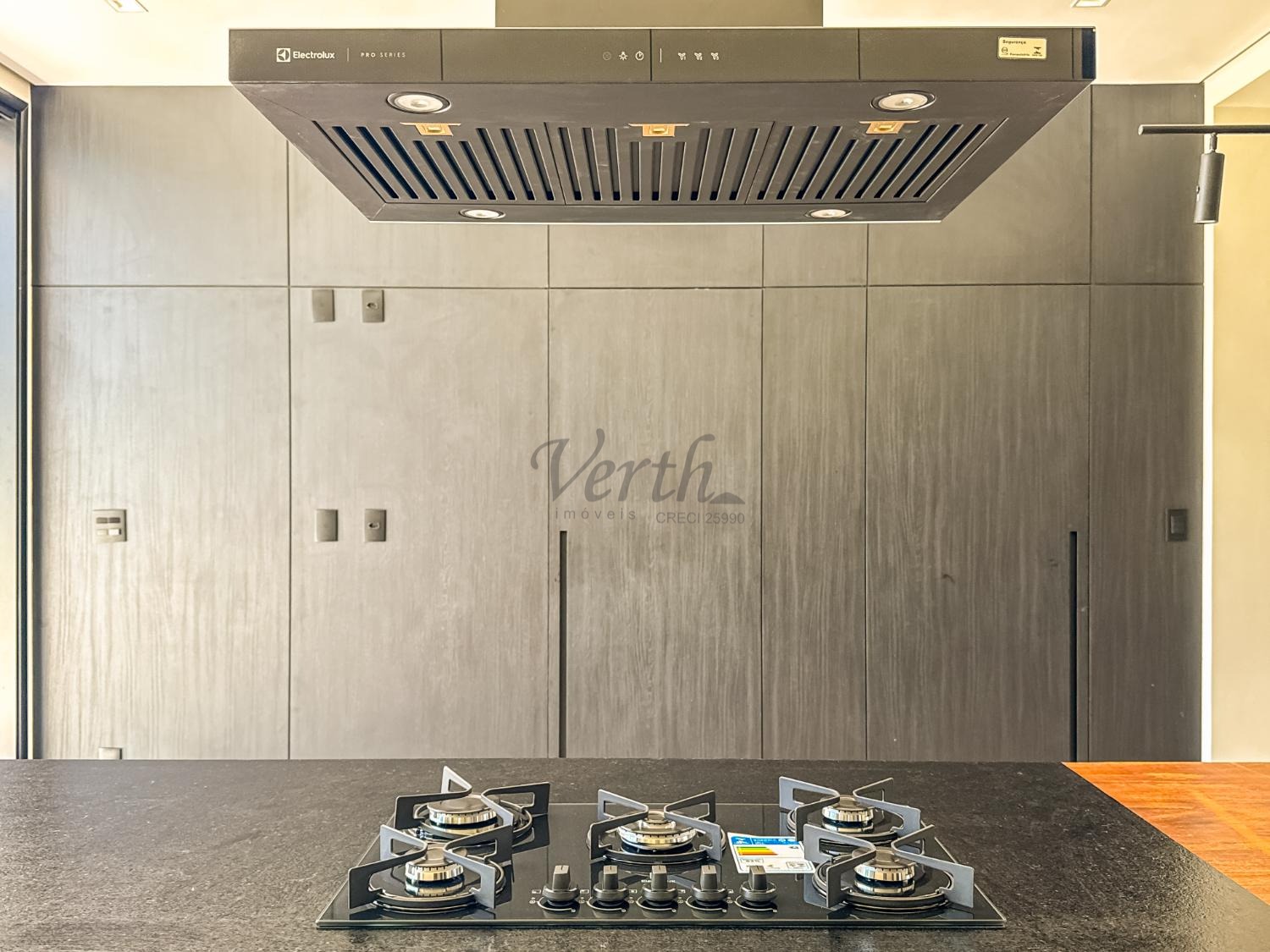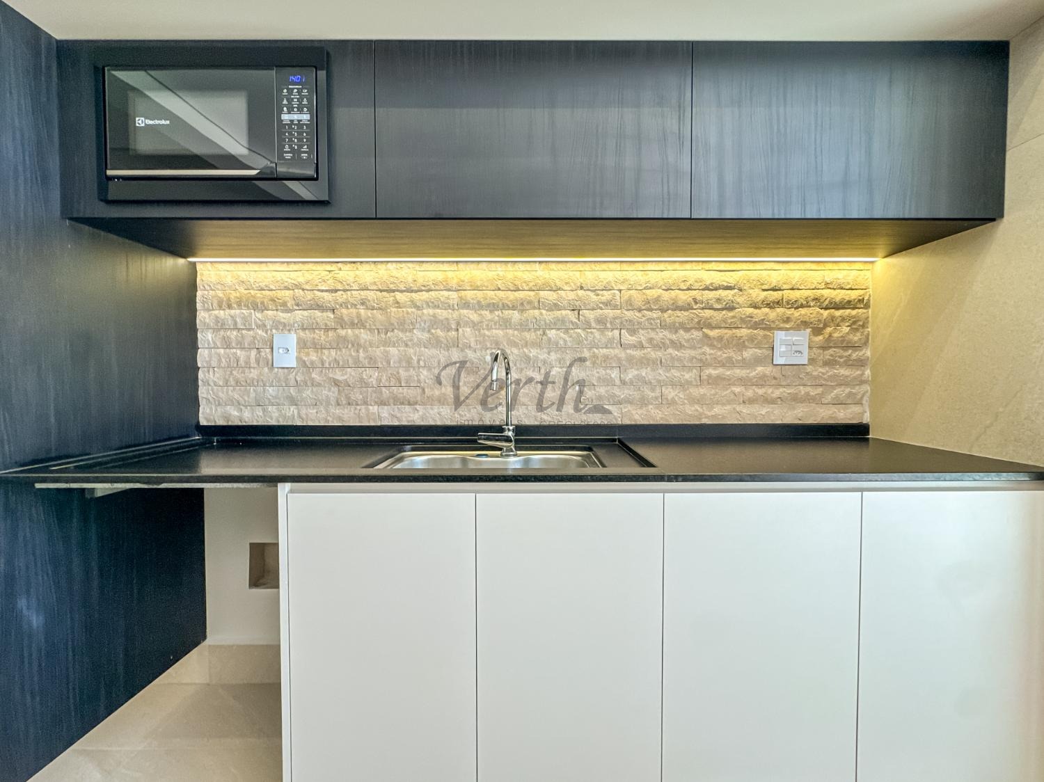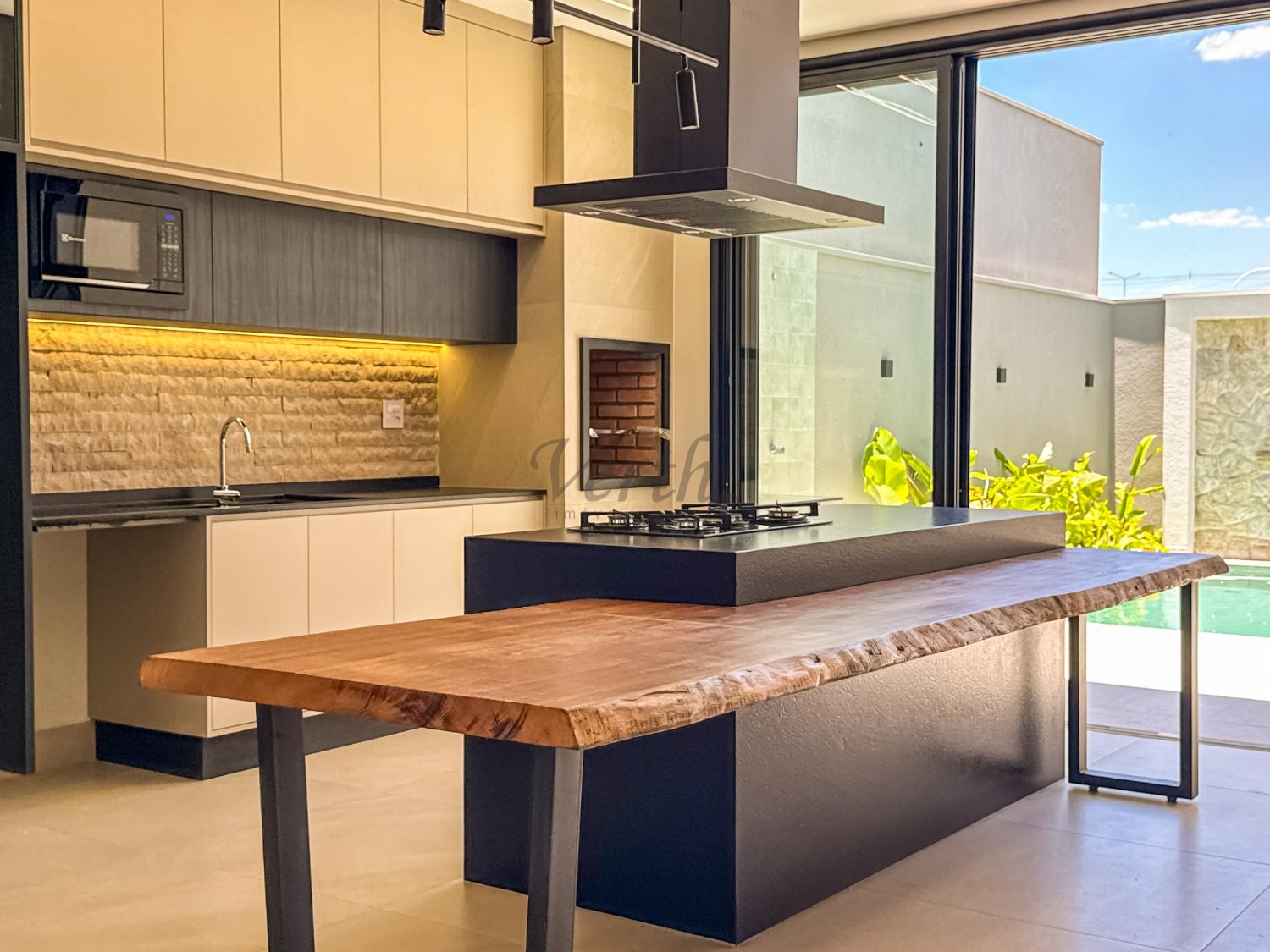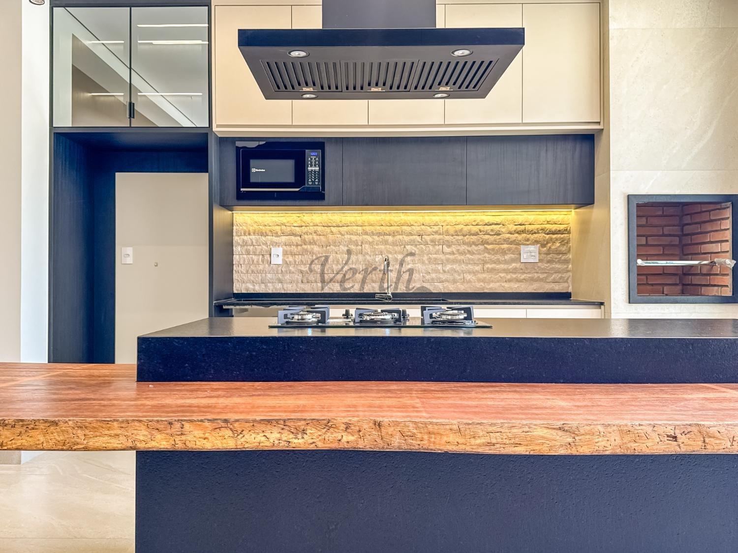Cozinha equipada com cooktop, forno, micro-ondas e coifa;