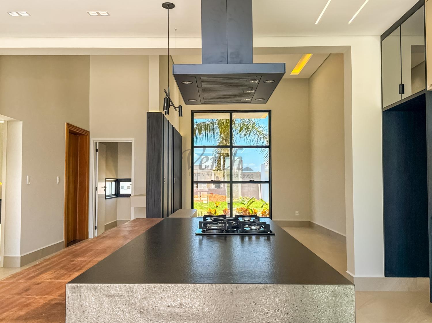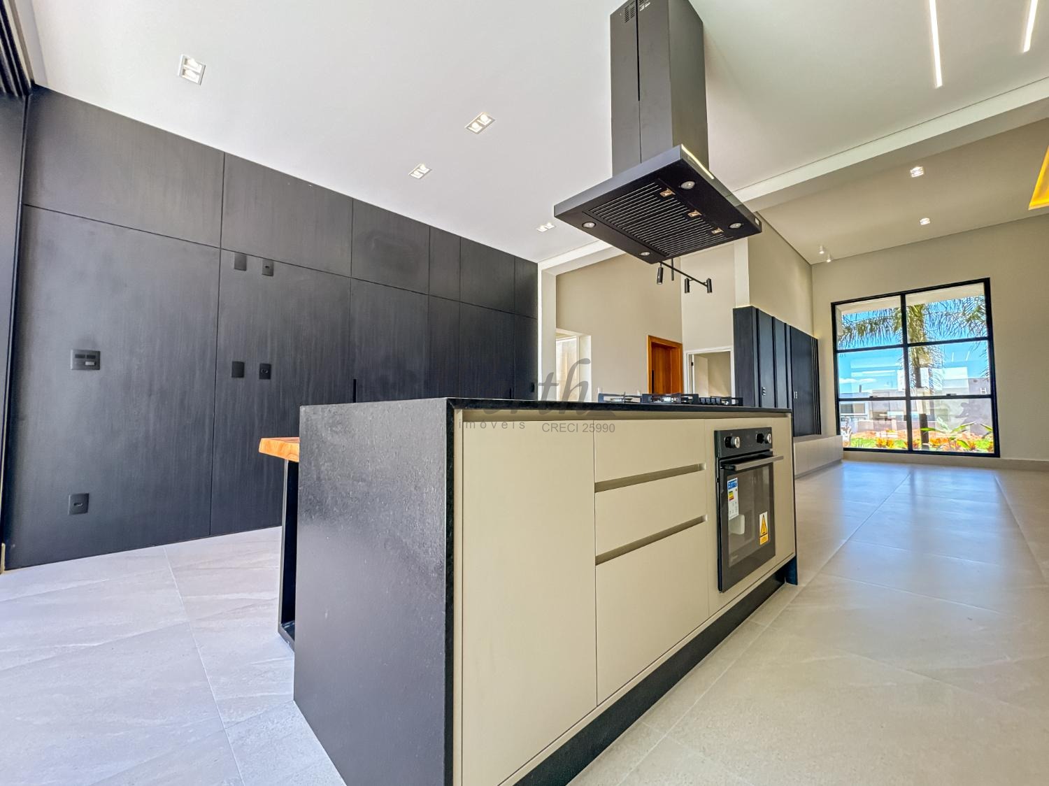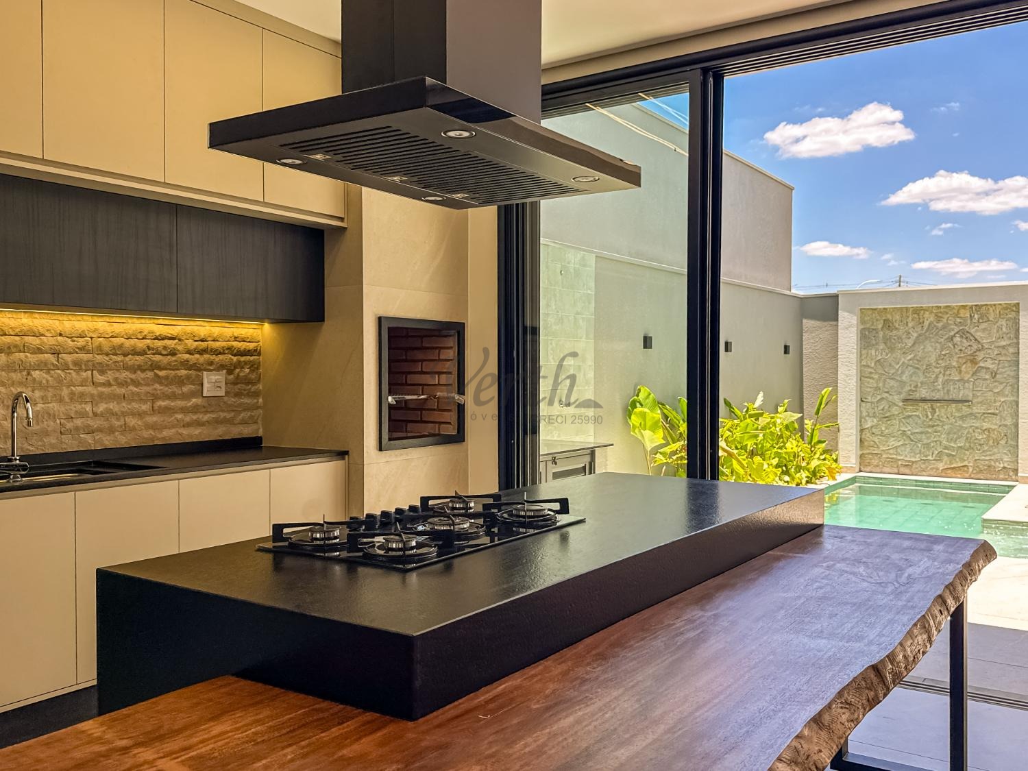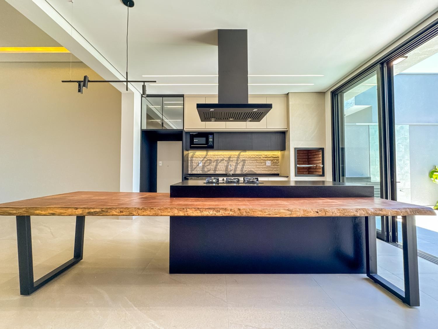 Cozinha equipada com cooktop, forno, micro-ondas e coifa;