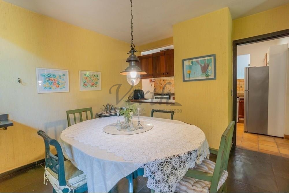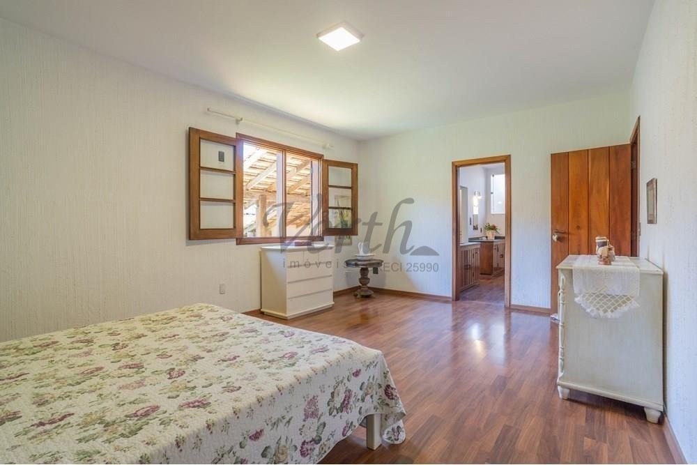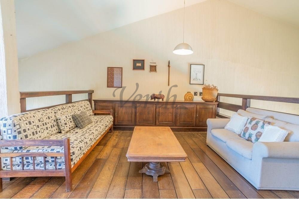 No piso superior, há 01 mezanino com sala de TV e sacada. A área íntima é composta por 05 quartos, sendo 03 suítes, e 02 quartos adicionais. Estes 02 quartos contam com 01 varanda, além de 01 banheiro social no piso e 01 roupeiro no corredor. A construção utiliza tijolos maciços e pedra bolão, com portas e janelas em madeira maciça.