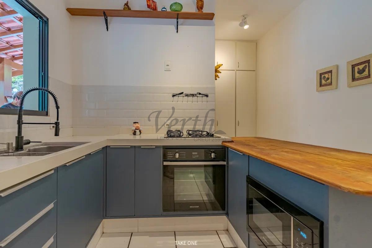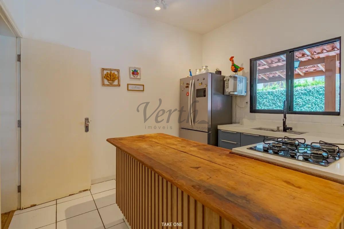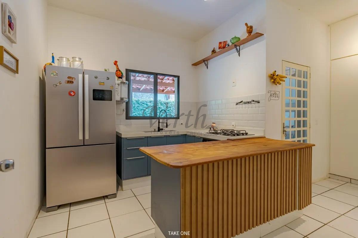 A cozinha é espaçosa e bem planejada, integrada à área de serviço. Na área externa, o imóvel dispõe de amplo quintal, espaço gourmet com churrasqueira e fogão à lenha, além de piscina, criando um ambiente ideal para momentos de lazer, convivência e descanso em família.