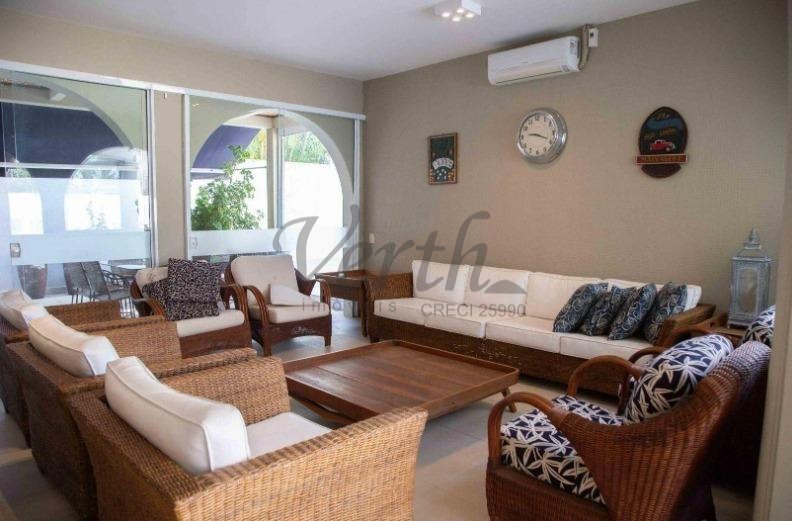 A área social se completa com lavabo, copa, cozinha planejada, área de serviço e depósito, todos com acabamento em porcelanato. Os ambientes contam com ar-condicionado, garantindo conforto térmico em toda a residência.