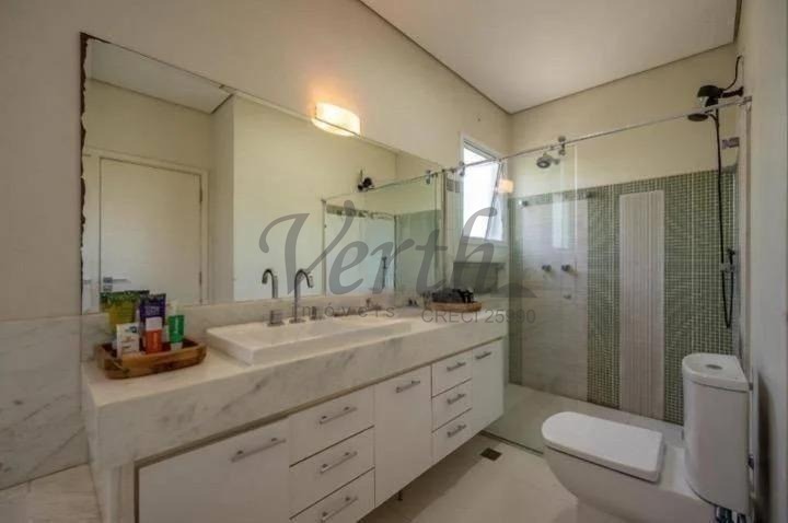 O imóvel dispõe de três suítes, todas equipadas com hidromassagem, além de dormitório reversível, escritório, lavabo e seis banheiros distribuídos de forma funcional.