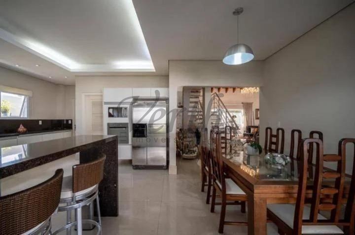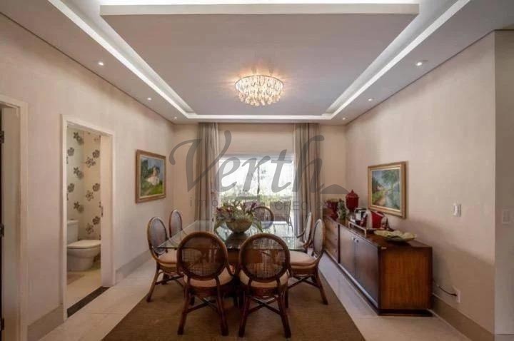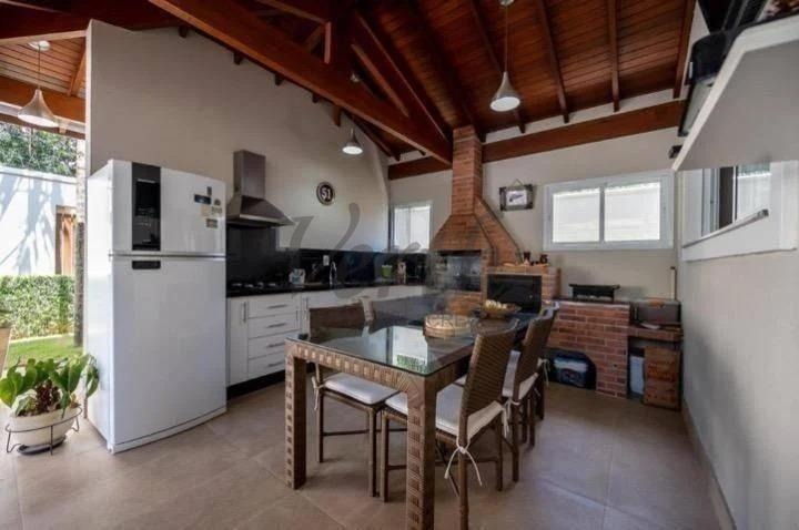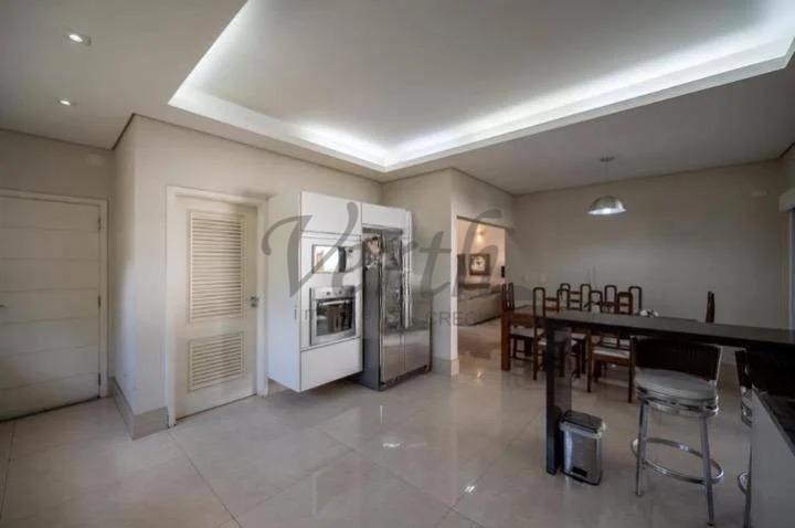 A área social é composta por duas salas de estar, sendo uma com lareira, sala de jantar e cozinha americana integrada à copa, com armários planejados. Conta ainda com despensa, área de serviço e banheiro de apoio.