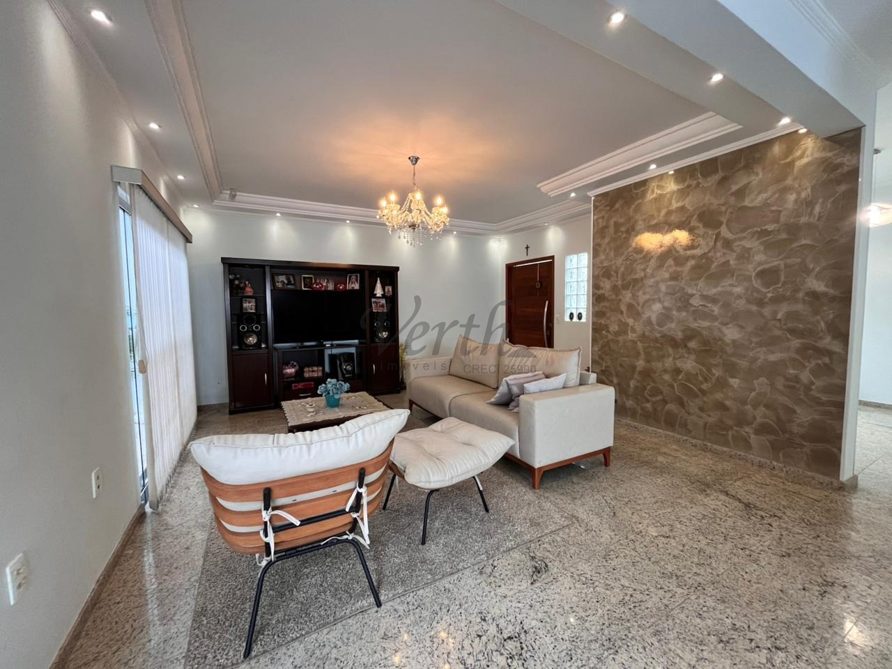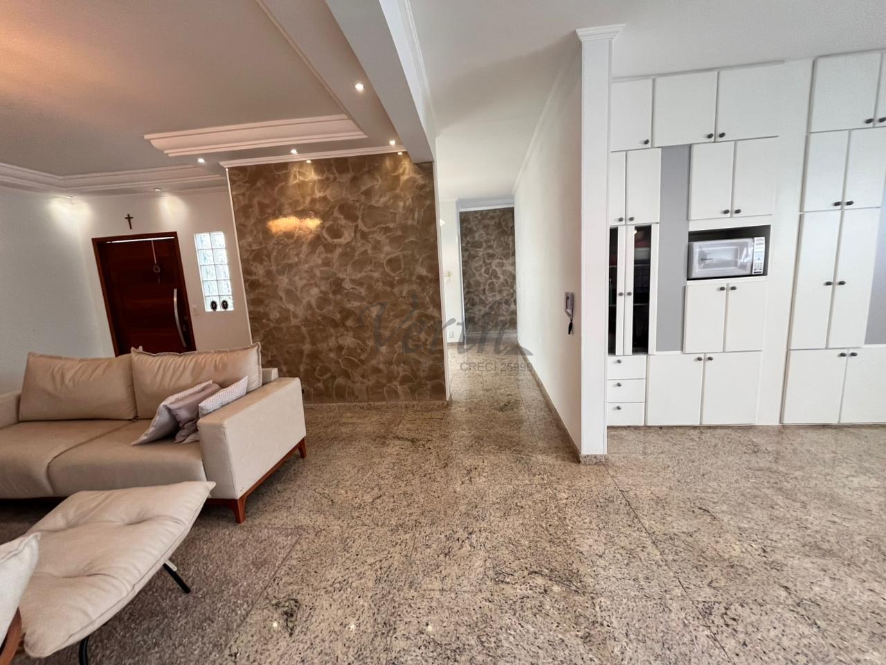 A sala de estar é aconchegante e integrada, ideal para momentos em família. A cozinha planejada garante excelente aproveitamento de espaço, unindo organização e sofisticação.
