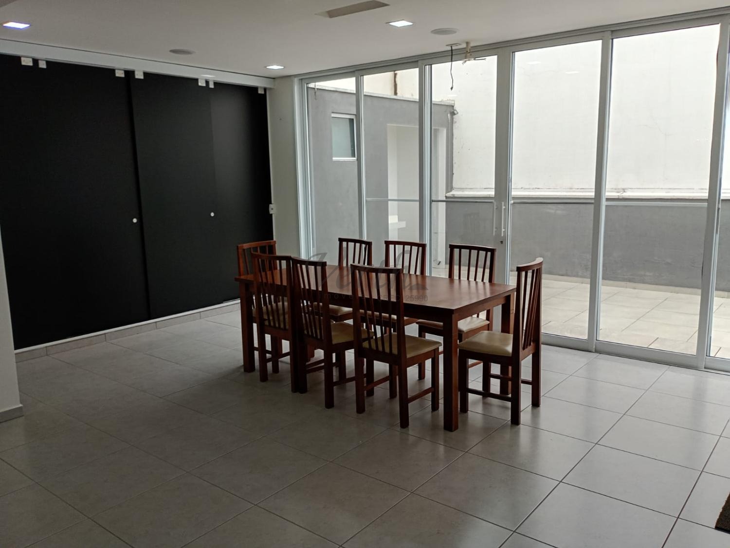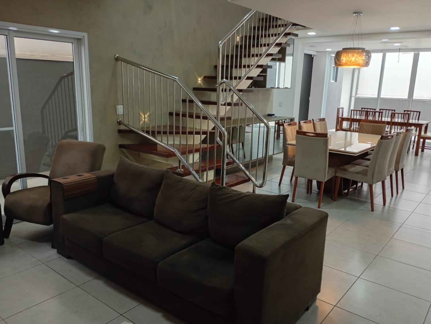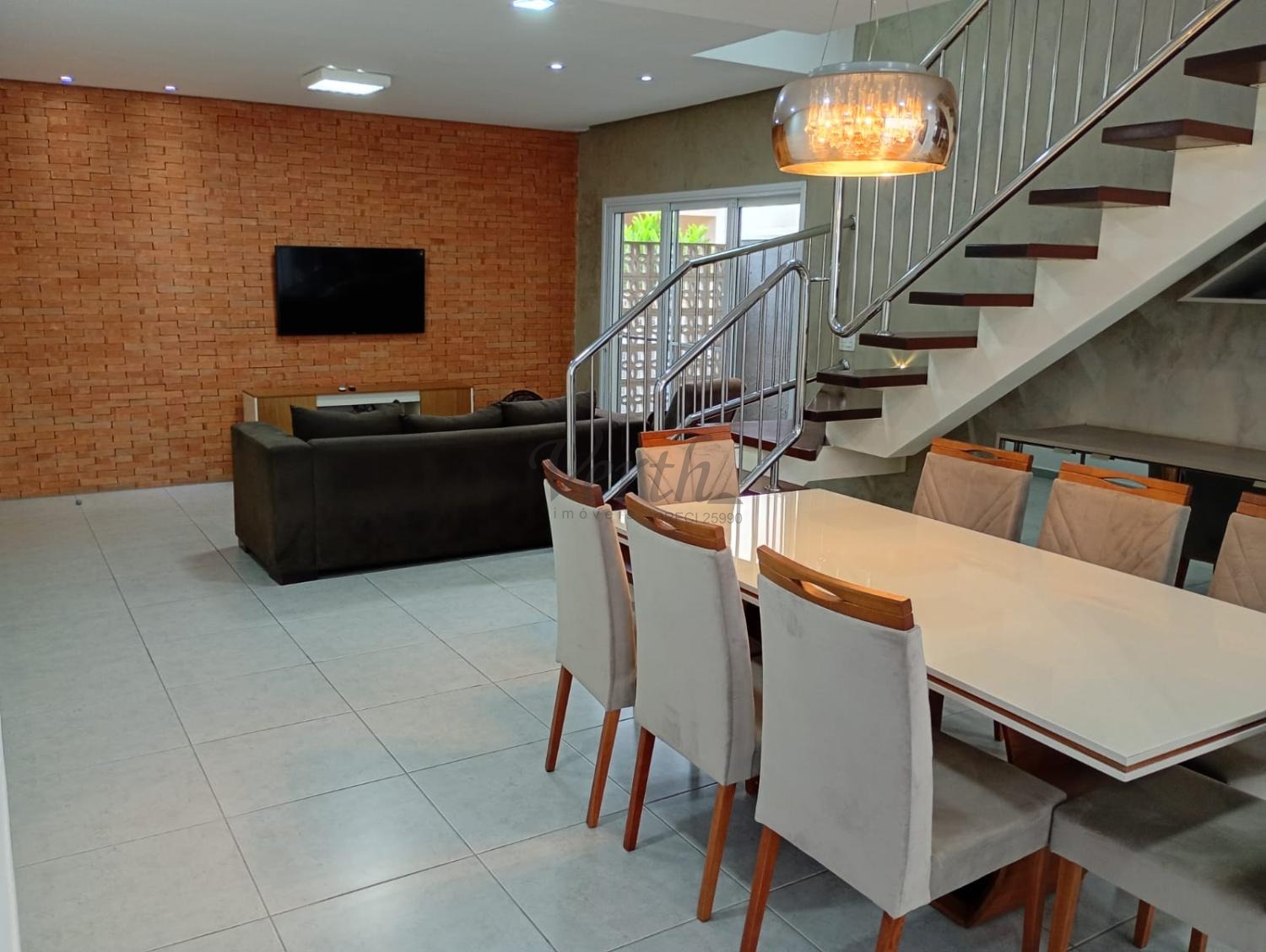 Sala de TV e sala de jantar integradas;